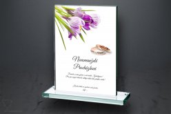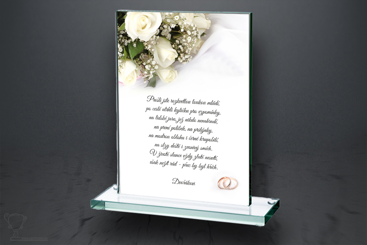 Blahopřání ke svatbě, zlaté svatbě, stříbrné svatbě ... je vytištěný technologií GRAWERTON přímo na plech. Tento plech je umístěn na skleněný stojánek 10 mm silný, který je v ceně výrobku.