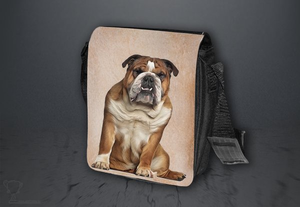 Nylonová vycházková taška s popruhem přes rameno, černé barvy. Velikost tašky je 21x20 cm. Na omyvatelné, odnímatelné ploše velikosti 17x20 cm je krásný paint potisk Anglického buldoga.