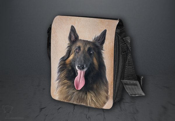 Nylonová vycházková taška s popruhem přes rameno, černé barvy. Velikost tašky je 21x20 cm. Na omyvatelné, odnímatelné ploše velikosti 17x20 cm je krásný paint potisk Belgického ovčáka Tervuerena.