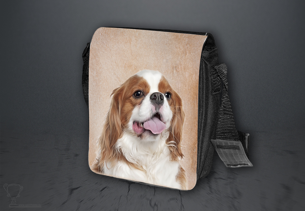 Nylonová vycházková taška s popruhem přes rameno, černé barvy. Velikost tašky je 21x20 cm. Na omyvatelné, odnímatelné ploše velikosti 17x20 cm je krásný paint potisk Kavalíra.