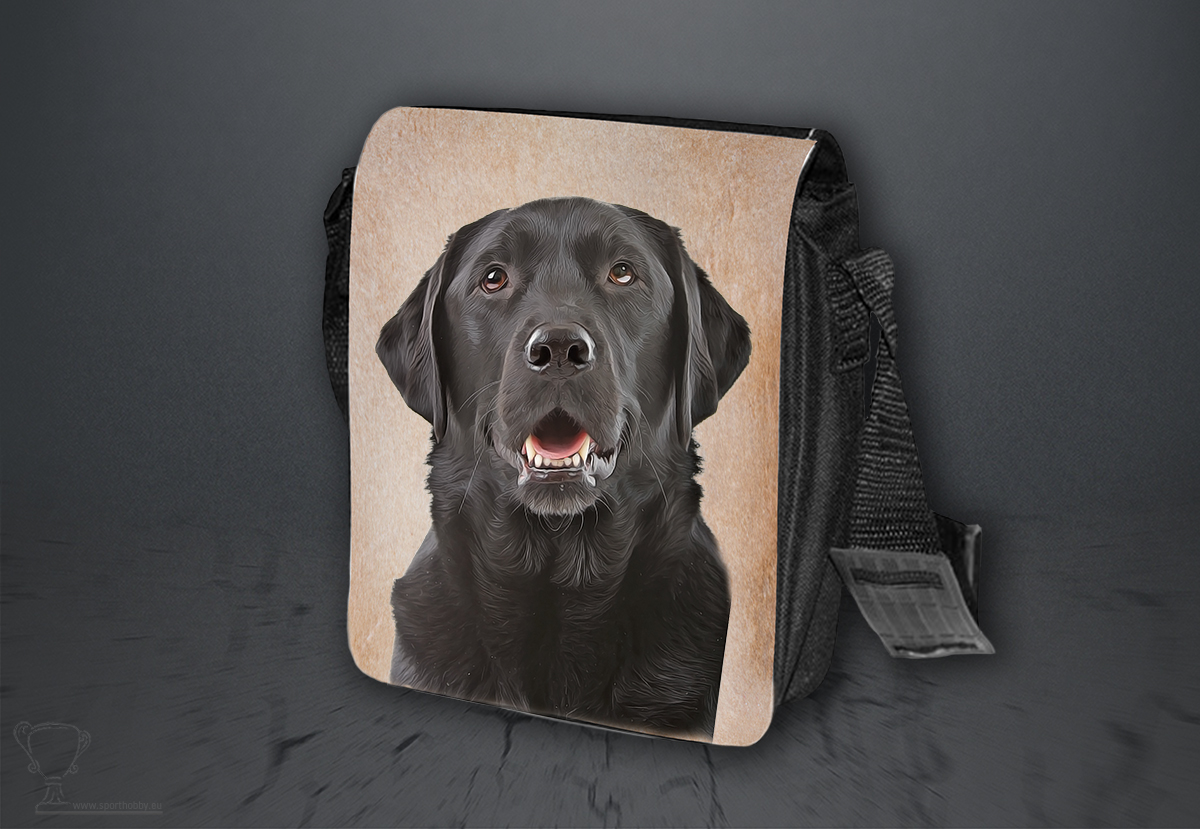 Nylonová vycházková taška s popruhem přes rameno, černé barvy. Velikost tašky je 21x20 cm. Na omyvatelné, odnímatelné ploše velikosti 17x20 cm je krásný paint potisk  Labradorského retrívra.