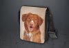 Nylonová vycházková taška s popruhem přes rameno, černé barvy. Velikost tašky je 21x20 cm. Na omyvatelné, odnímatelné ploše velikosti 17x20 cm je krásný paint potisk Nova Scotia duck tolling retrívra.