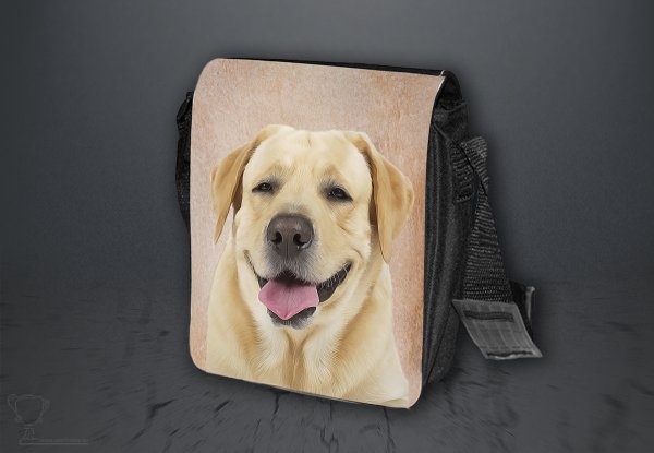 Nylonová vycházková taška s popruhem přes rameno, černé barvy. Velikost tašky je 21x20 cm. Na omyvatelné, odnímatelné ploše velikosti 17x20 cm je krásný paint potisk Labradorského retrívra.