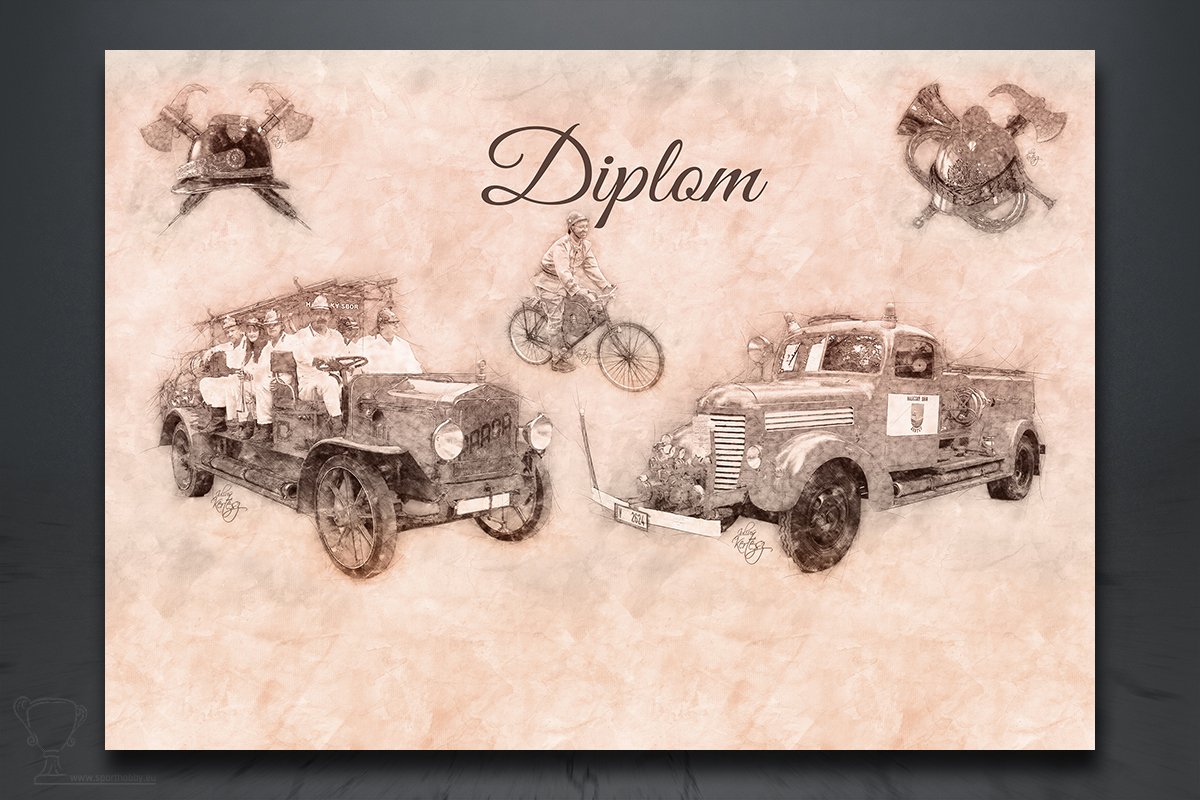 Hasičský diplom s historickým motivem je tištěn ofsetovým tiskem na tvrdý křídový papír 200 g/m2. Velikost A4 - 210 x 297 mm a A3 - 420 x 297 . Na diplom lze dotisknout text v laserové tiskárně, nebo dopisovat ručně. Cena je včetně 21% DPH.