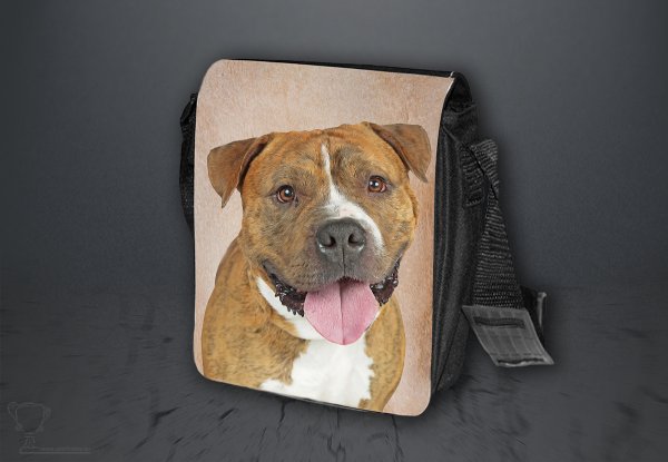 Nylonová vycházková taška s popruhem přes rameno, černé barvy. Velikost tašky je 21x20 cm. Na omyvatelné, odnímatelné ploše velikosti 17x20 cm je krásný paint potisk Americký pitbulteriér.