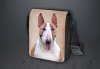 Nylonová vycházková taška s popruhem přes rameno, černé barvy. Velikost tašky je 21x20 cm. Na omyvatelné, odnímatelné ploše velikosti 17x20 cm je krásný paint potisk Bullterier.