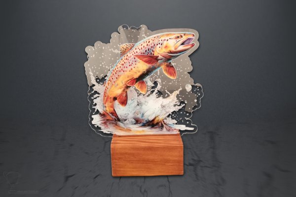Akrylátová trofej pstruh potoční s UV potiskem. Tisk jednostranný. Trofej z 4 mm tlustého potištěného akrylového plastu na dřevěném podstavci.