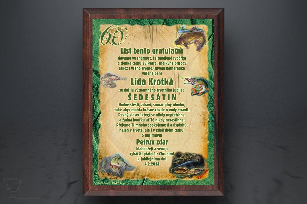 Rybářské blahopřání k životnímu jubileu, je vytištěný technologií GRAWERTON přímo na plech. Tento plech je umístěn na dřevěnou desku, která je v ceně výrobku. Je možné zavěšení na stěnu, nebo postavení do stojánku. Jména i veškerý text je možné měnit dle Vašeho požadavku. Po vložení do košíku jej můžete libovolně editovat a měnit.