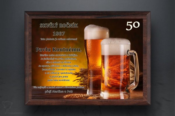 Blahopřání k životnímu jubileu, nebo jako slavnostní certifikát k různým významným událostem je vytištěný technologií GRAWERTON přímo na plech. Tento plech je umístěn na dřevěnou desku, která je v ceně výrobku. Je možné zavěšení na stěnu, nebo postavení do stojánku.